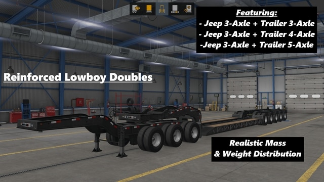 This mod adds three new reinforced Lowboy Double configurations, each tuned with real‑world trailer weight and proper load distribution. These setups fill the gaps missing from ATS’s default lowboy double...