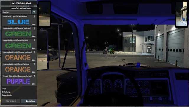 This mod provides interior cabin-light glow in choice of blue, green, orange, purple, red, and white.