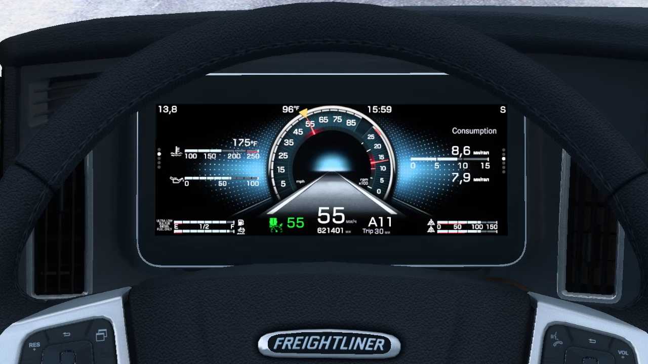 This mod improved SCS Freightliner Cascadia 2019 Digital Dashboard: – added cruise control speed indicator; – added average (trip) consumption indicator; – added trip distance; – added retarder icon; –...
